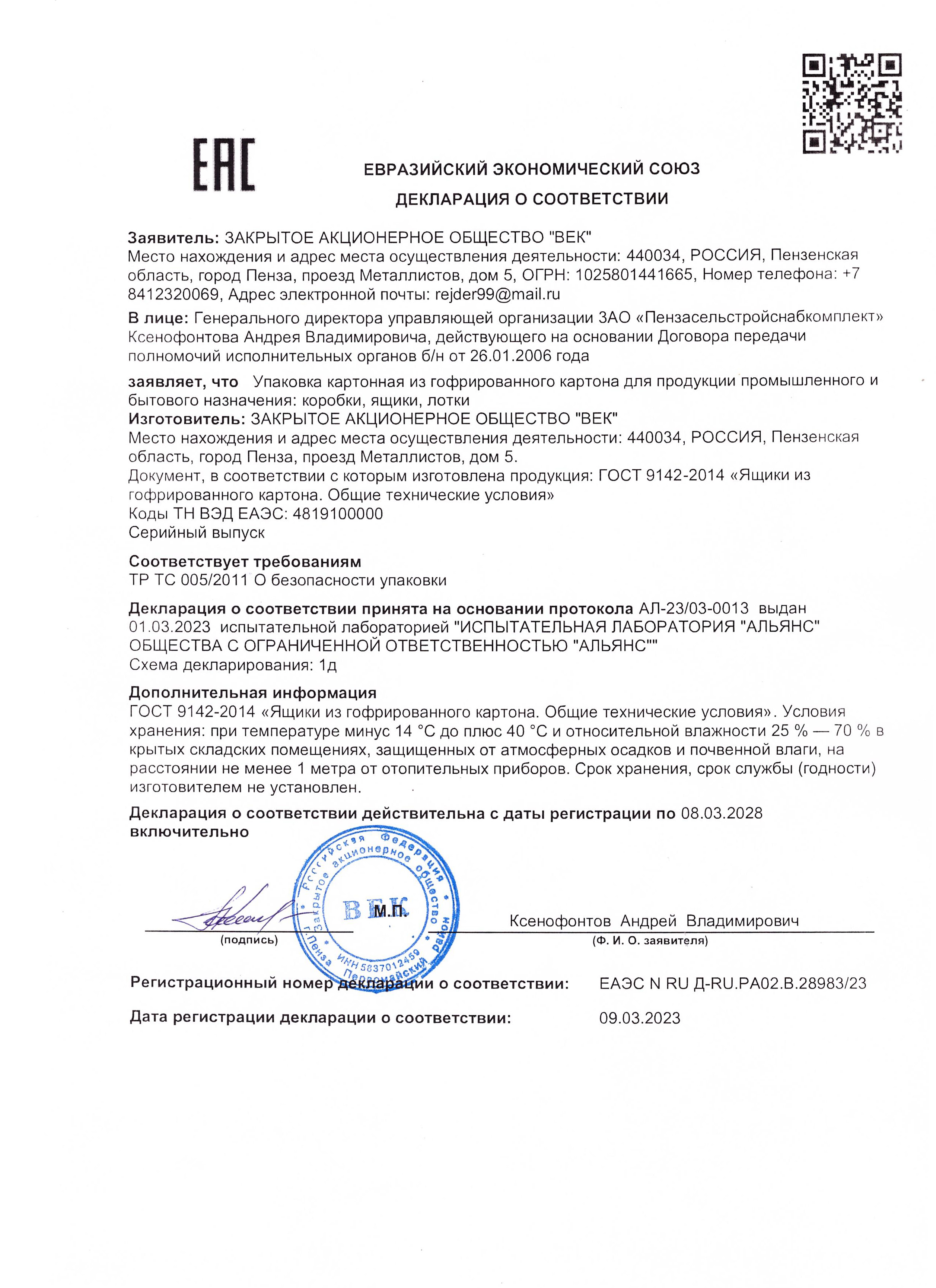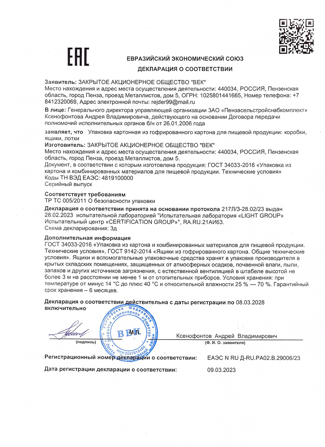 Закрытое акционерное общество «Век» специализируется на производстве двухслойного, трехслойного гофрокартона, картонных коробок и реализации готовой продукции по низким ценам от производителя. Наличие собственного производства, использование современного оборудования, профессионального коллектива и контроля качества позволяют изготавливать гофрокартон и картонную тару.